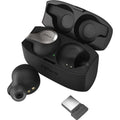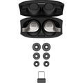 Enjoy untethered listening with the titanium black Evolve 65t UC Wireless Earbuds from Jabra. These lightweight earbuds are completely cable-free and connect to your smartphone via Bluetooth 5.0 and to your computer via the included Jabra Link 370 USB adapter. It can connect to two devices simultaneously. With four microphones built in, these earbuds are designed to offer clear call quality thanks to its ambient and passive noise cancellation technology. If you want to also be aware of your surroundings while you listen to audio, you can double press the multi-function button to hear the outside world without taking out your earbuds. Furthermore, these buds feature a versatile speaker that can operate at 20 Hz to 20 kHz in Music Mode and 100 Hz to 10 kHz in Conference Mode.