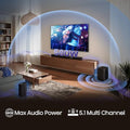 • 【5.1 Channel】Enjoy a true 5.1 channel surround sound, bringing movies, music, and games to life, including a front sound bar, a wireless subwoofer and semi wireless rear speaker kit.