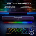 - Compact Desktop Form Factor for room-filling sound and minimal footprint. The compact soundbar fits perfectly beneath your monitor to keep your desktop clutter-free, while detachable rubber feet keep it angled towards you for minimal audio obstruction.